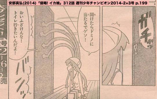 このあたりについては、文脈を見てみると理解が深まります。ドミノ倒し遊びをはじめた イカ娘が、ドミノを並べているうち、栄子がいる部屋のドアの前にもドミノを並べてしまった。 それを知らずに部屋にいて、トイレに行こうとした栄子をイカ娘が力ずくで止めるわけです。曰: