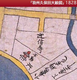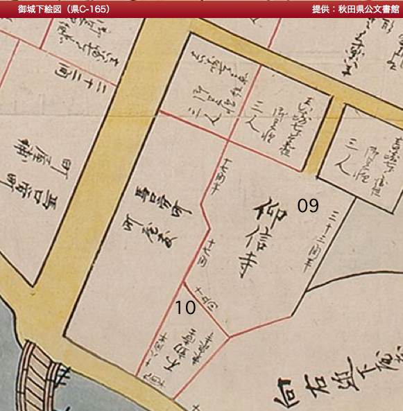 「御城下絵図(県C-165)」(1742(寛保2)年) [APL] の地図を見てみますと。 「久保田三十三」の札所とされている月居山東泉寺は、仰信寺(現09)のすぐ裏にあったよう です(ただ「不動堂」の文字が大きくて、その横に小さめに「東泉寺」と書かれているところから 判断すると、1742年の段階でほぼ廃寺状態だったんでしょうか。1828年の地図 [APL]には 「不動」としか書いてません‥)。この東泉寺、 09番と11番の間に位置しているということで、やはり当初の10番札所だったんでしょうね‥。