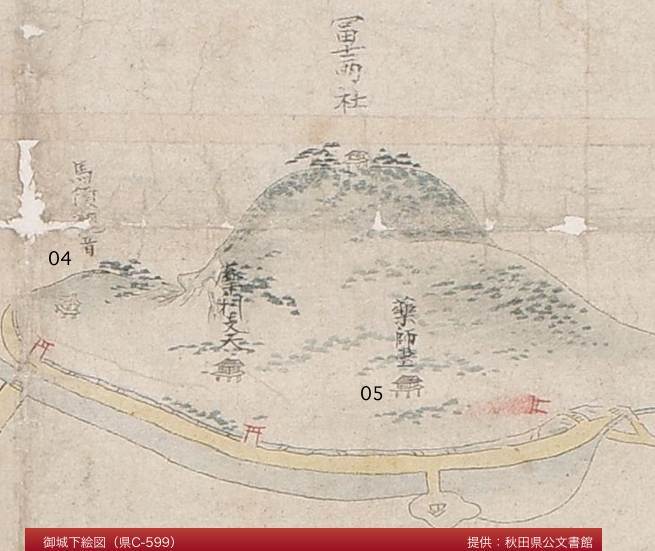 [Table of Contents]明田(妙田)にある富士山、その麓にある4,5番札所がその痕跡と思われます。右図が 「御城下絵図(県C-599)」(1759(宝暦9)年) [APL]の、明田富士近辺です。 いちおう番号を付けていますが、どちらが04でどちらが05かというのは、テキトーです。