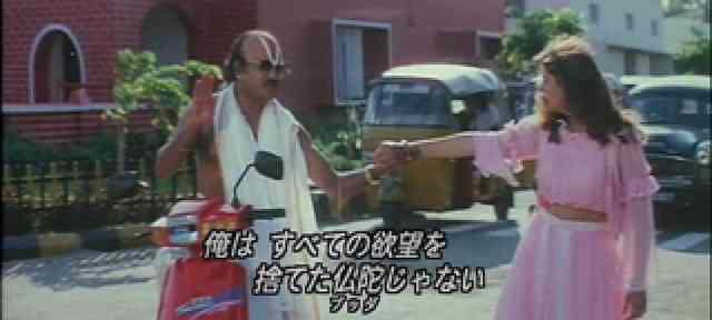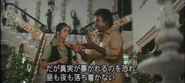 ラジニ演じる、孝行息子かつ人気者の自動リクシャー運転手、マニカム。 テッテ的に非暴力に生きるマニカムには秘密の過去があった‥ というお話。 マニカムは悪いことはしたくないという。何故かといえば。 悪事を働いてしまうと 「真実が暴かれるのを恐れ 昼も夜も落ち着かない」(右絵)、だから悪いことはしたくない、と。 マニカムはこれでヒロインのプリヤーの信頼と愛情をゲットしちゃいます。 プリヤーはもうこんな感じ。 見かける男が全部ラジニ、じゃなくてマニカムに見えるみたいです。 [たいりたいりだーん(?)]も あったりして、プリヤーからマニカムにコクったりしますけど、 マニカムはよい返事をしません。 (まあ、結局はマニカムの嫁になるんですけどね。)