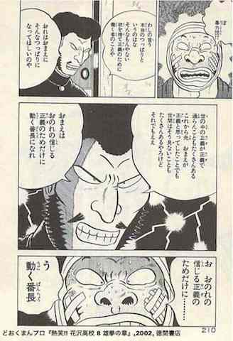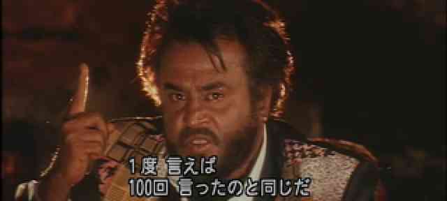 「神は試練を与えるが 善人は見捨てない」‥ここでの「善人」というのは マニック・バーシャ自身のことです。他人がどう思うかはわからない。 でも自分が正義と感じた信念を貫く‥なんかそのパターンはどこかで 見たことが‥と思ってましたが、そうか。昔、週刊少年チャンピオンで 連載していた、どおくまん先生の「熱笑!! 花沢高校」だ。 曰「わしの言う 本当のつっぱりと いうのはな ‥(略)‥ 欲を捨て正義のために働く者のことや // ‥(略)‥ 世の中の正義が正義で通らんこともたくさんある / これから先 おまえが 正義と思ってしたことでも 世間はそう見ないことも たくさんあるやろけど それでもええ // おまえは おのれの信じる 正義のためだけに 動く番長になれ」[*] ‥やっぱ、こういうのは あこがれますよね。マニック・バーシャはまさにここでいう 「本当のつっぱり」ですね!! (かなり以前に見たのであやしい記憶なのですが。 「だらぱてぃ」も確かそんな感じだったような記憶があるんですけど、まあラジニは 絶対善の体現者のような位置付けになってますから、キャラに影をつけようとすると どうしても「本当のつっぱり」的にならざるを得ないんですけどね‥)![]()