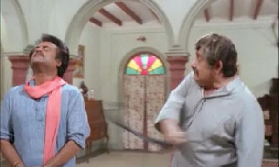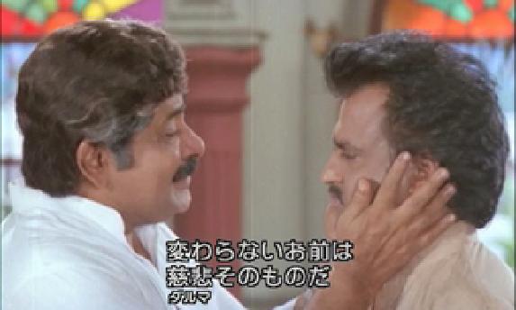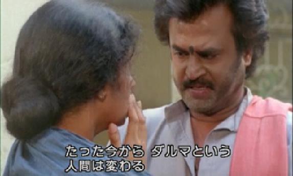 話は現代(?)に戻って。 ラージャとラーマが刺客に拉致されてしまい、困ったラージャ妻と娘は、 ダルマに助けを求めに来ます。(あんな無防備な状況で、回想シーンと現代のあいだ、 よく無事で過ごせたな、という感じではありますが‥。) 相変わらず動く気配のないダルマでしたが。そこに妻パールワティが。 「私は何もねだらなかった 初めての頼みよ 私のためにお願い 弟たちを助けに行って」‥‥ダルマが立った! そしてクライマックスに 行くわけですけど。ずっとダルマをひどい目に遭わせてた弟たちを 助けるための大活劇というのは、なんかいまいち爽快感が‥というのは ありますけど、でもやっぱラジニの大活躍はいいですね。 右腕を銃で撃たれてもほとんど影響ない感じですし、それよりも ビルから落下するシーン。これは死ぬだろ?! おおおおー!?