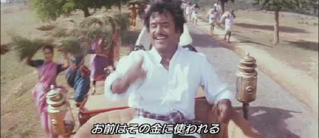 手の中にお金が少しあれば お前はその金を使えるこれ、はじめて「ムトゥ」を見た時から、かなり強く私の心に残ったフレーズです。 「生きる意味を知って 生を楽しもう」 ‥夢中になって のど元までお金を詰めることが、 あなたの人生にとってどういう意味を持つんですか? という問いですよね。 「生を歓ぶのが人の本来の姿 苦しい人生はあってはならぬ」 ‥正直これはよくわかりません。 古いインドの輪廻・解脱的価値観からいえば 人生は苦しみに他ならないはずですので、 「生を歓ぶのが人の本来の姿」という言葉は出てこないはずなんですけど。 よくわからないですけど、さすがに現代になるとインド人も現世中心的な考えが出てきて それなりに定着してるという感じなんでしょうね。(すみません。インドについては 大昔のことしか知らないもので