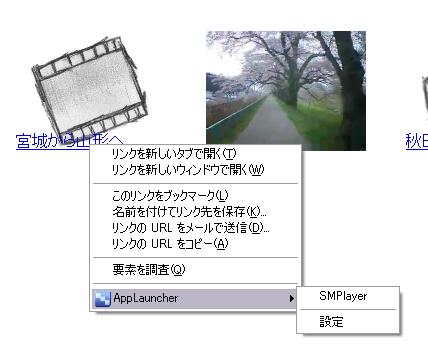 そして再度、動画へのリンクのところで右クリックしてしましょう。すると コンテクストメニューの下、「AppLauncher」のサブメニューの中に、 「SMPlayer」という項目が出現すると思います。そしたら、その「SMPlayer」を 選択してみてください。それでSMPlayerが起動して、動画を再生しだしたら成功です。 こんな簡単にできるとは‥。