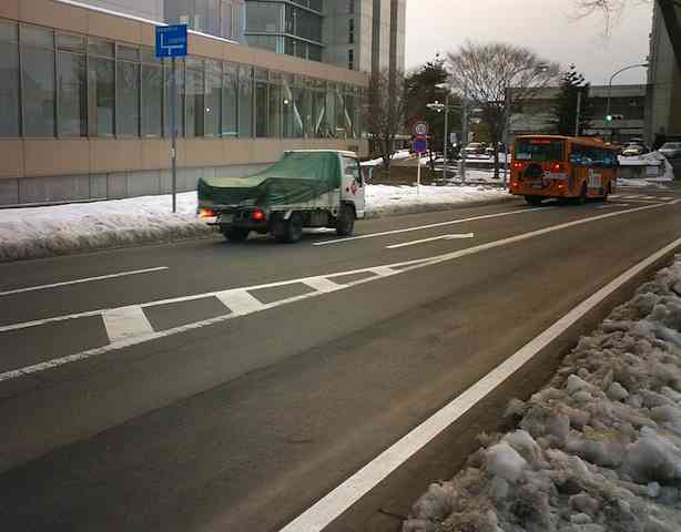 中途半端に融けた雪が凍ってて、車道がけっこう恐い状態になって
