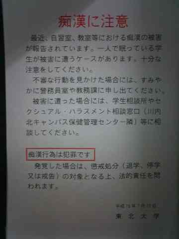 あ。そういえば今日こんなのを見つけました。 そういう掲示が出てるという話だけは聞いていたんですけど、 なぜか女子トイレの前にだけ貼られてるみたいなので 今まで目にすることがありませんでした。 (平成16年と書いてあるけど、ウチのへんにはごく最近貼られたらしいので、 ついに俺の近くでも事件が起こったのか? でも聞いてないぞ)