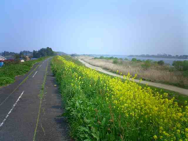 この写真みたいな川沿いの堤防の道を、いい天気の日に チャリで走ると じつに気持ちいいなー、という感じなんですけど、 この写真を撮った後、 アリくらいの大きさの虫が目の中に飛び込んできて悶絶ですよ。