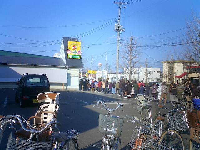 左が12日、右が13日の様子です。スーパーに並ぶ人たち。 (いつぞやの宮城県沖地震もこんな感じだったようです。大災害による生活物資の困窮 というのはどうしようもないんでしょうね‥。) 12日は2時間、13日は1時間並びました。12日なんて、二時間並んで入手できたのが グレープフルーツ1個、ビスケット1袋、南部せんべい2袋、ネクター1缶、 電子レンジ専用のカップスパゲティ2個(停電中なのに‥ 結局お湯かけて食いました)、 ペットボトルの麦茶1本‥。でも買えるだけマシでしたね。といいながら、徐々にモノが 入ってきてるらしいとニュースでやってましたが、キャベツ一個500円と書いてた! げえっ!!![]()