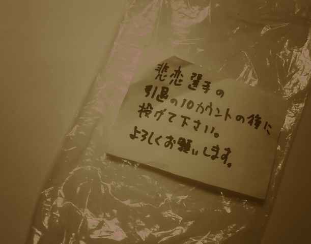 今年はじめてプロレス見に行ってきました(というか、なんか、すげー久々な気がする)。 仙女、悲恋選手の引退興行でした。悲恋選手、お疲れさまでした。大きいケガもあったから 仕方ないんですけど、ようやく「客を呼べる」感じになったというのに‥というところでの 引退はやっぱ残念です。金子選手のリングネームが「悲恋」になると聞いたときは 「何それ? 名前なの??」と思ったものですが、やっぱ時間が経過すると慣れますね。 人間て不思議。‥というのはともかく。休憩時間に、私の近くの席にいた レッドフレンジャーの人かな? に、「良かったら これ投げてください」と 紙テープをもらいました。紙テープの入ったビニール袋に貼られた メッセージ。今どき手書きか‥というあたり、悲恋選手に対する彼らの思いを感じました。紙テープが入っていた残骸