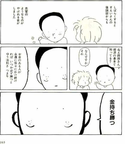 私はこのニュースを見て、「まあじゃんほうろうき」の「経済の基本」の話を思い出しました。 その基本を知っていれば、彼が何故そこまでの巨額をカジノに費やしたかというのは あまり不思議には感じないですよね。「ああ、負けが続いたまま資金切れか。所詮、その 程度の金持ちにすぎなかった訳ね。そんな程度の金しかないのにギャンブルに手出すなんて アホか」という印象です。経済の基本 (西原理恵子(1996)『まあじゃんほうろうき下巻』竹書房文庫. p.165)