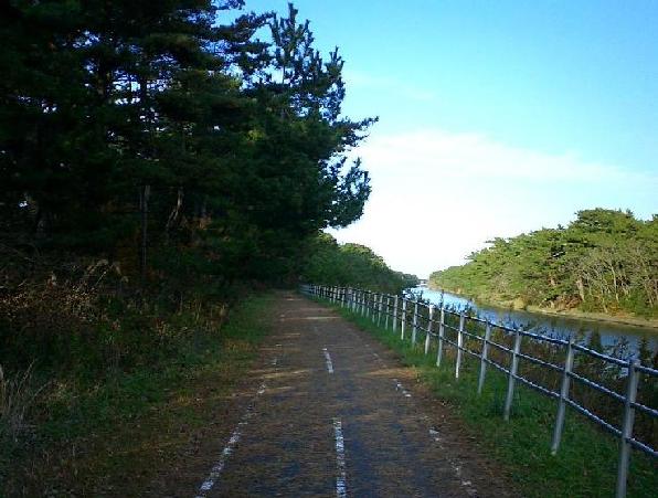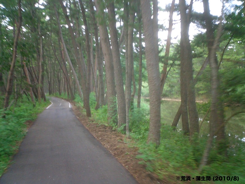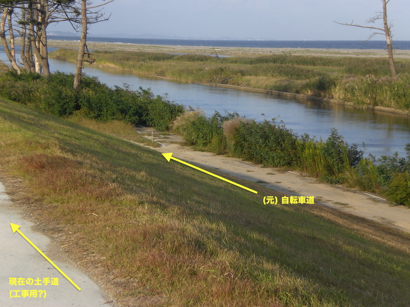 ‥そうか。あの自転車道は たぶん廃道か‥。このへんは地盤が沈下して貞山堀の水位もずいぶん 上がった感じがしますし、仕方ないかもしれませんね。それとあと景色。見晴らしがいいですね。 まあ、閖上大橋のへんから海が見えるようになったわけですから、ここでも海が見えて当然なんですけど。 改めて、うわー、という感じです。ちなみに、津波前の自転車道の写真を探してみたらこんな感じ: