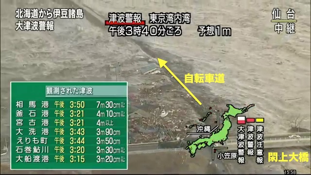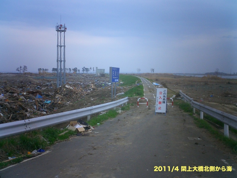 写真で見ると それほどでもないように見えるかもしれませんけど。斜めから見るとハッキリ クッキリ ポッコリと タイヤが膨らんでいます。チューブの空気圧にタイヤが負けてしまってるんですね。 ちょっとこれはもう限界か‥。タイヤ交換はさすがに自分でやるのは面倒なので、いつもの チャリ屋に持っていこうと思ったんですけど。でもパンク修理した直後に交換というのは、 ちょっとアレじゃね?! ‥と思い、チャリ屋に行く前に、ちょっと徘徊します。 なんとなく閖上大橋のへんまで行ってみたんですけど。そこで気付きました。以前は、 閖上大橋の北側(仙台側)の袂から海に向かう道 [参考 (閲覧注意)]、大津波前は自転車道だった道には 「立入禁止」の看板があったんですけど、 その看板がなくなってるじゃないですか。お、行けるの?! と思い、さっそく、大津波以来でははじめて、貞山堀エリアに入りました[このへん (閲覧注意)]。