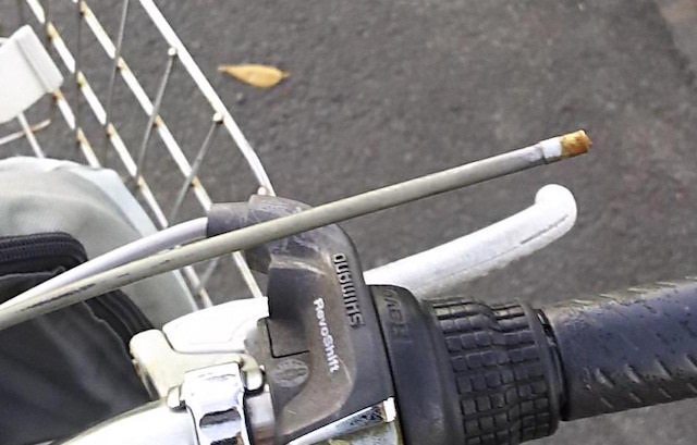 自転車乗ってました。赤信号で止まろうとしました。すると「ぶちっ」と音がして‥‥ 前ブレーキのワイヤーが切れました! びっくり![]()
