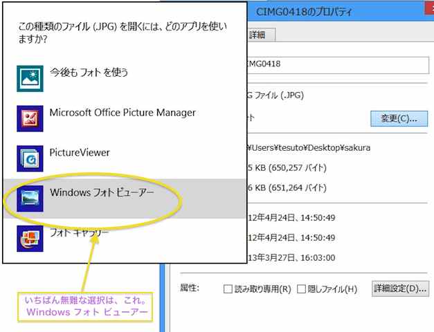 これまでのWindowsのように、ウィンドウで表示するようにしたい時は、 一度「関連付け」の変更というのを行う必要がある。 (この例では「Windows フォト ビューアー」という、標準装備されてる ソフトで表示している。)![]()