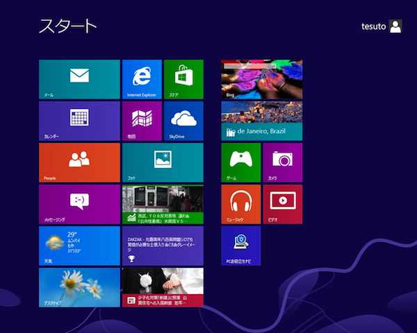 [Table of Contents]Windows8(以後Win8)を起動して自分のユーザ名で「サインイン」(ログオン)すると、 上のような「スタート」画面となる。 このスタート画面がWin8の基本だ。 これは従来の「スタートメニュー」の拡大版といえそうだね。