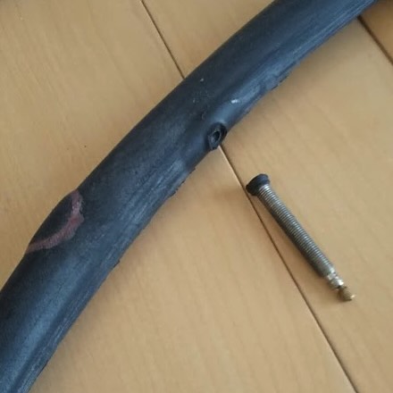 自転車の前輪の空気がちょっと抜けてるかな? と思って空気を入れた瞬間。 プシューと音がして前輪の空気が完全に抜けました。 何が起こったかよくわからなかったんですけど。チューブみてみたら、なんと。 バルブがチューブから取れてました。 こんな綺麗に取れるってことは前から取れかけてたんじゃないかと思うんですけど…。 でも昨日乗って何ともなかったんですけどね。いったい何が起こったというのか